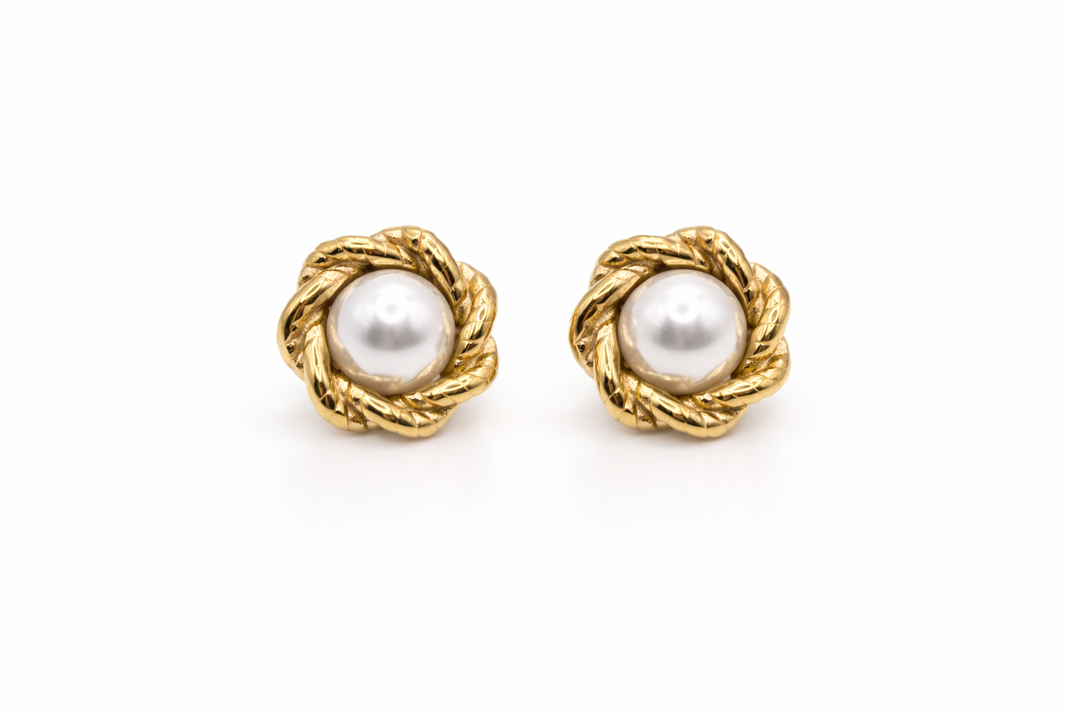Brincos Emily em aço inoxidável dourado, com pérola de acabamento delicado envolvida por um design texturado. Um clássico intemporal, pensado para um toque de elegância discreta no dia a dia.