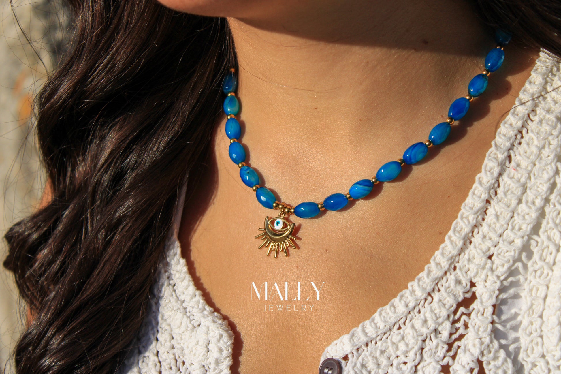 Feito à mão com todo o cuidado e atenção aos detalhes, este colar exclusivo da Mally Jewelry combina elegância e significado em uma só peça. As contas em tons vibrantes de azul destacam-se pela sua luminosidade natural, transmitindo frescor e sofisticação.