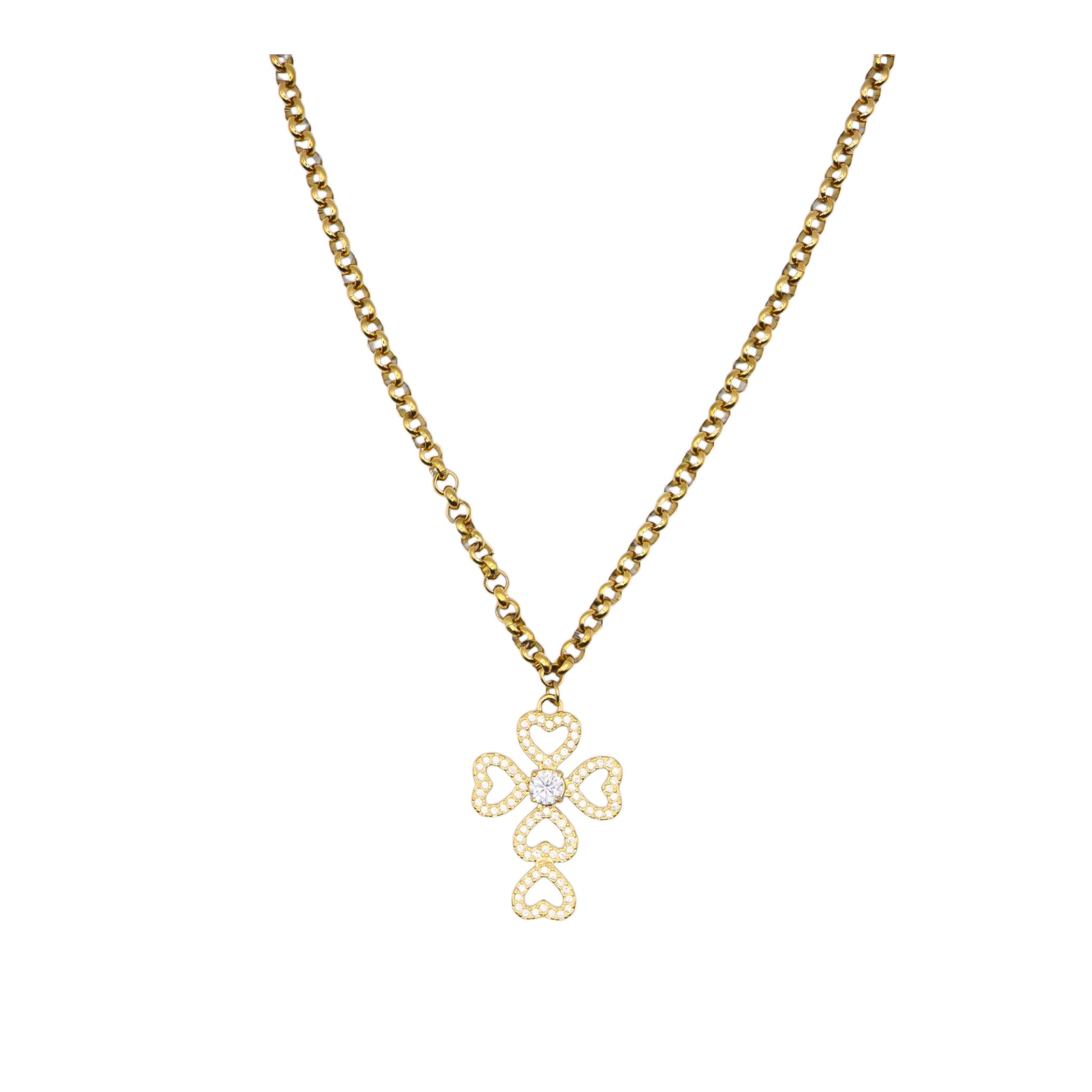 Este colar em aço inoxidável apresenta um pendente em forma de cruz composta por corações delicadamente cravejados. O desing romântico aliado ao brilho sutil faz desta peça uma escolha perfeita para destacar qualquer look com charme e sofisticação.