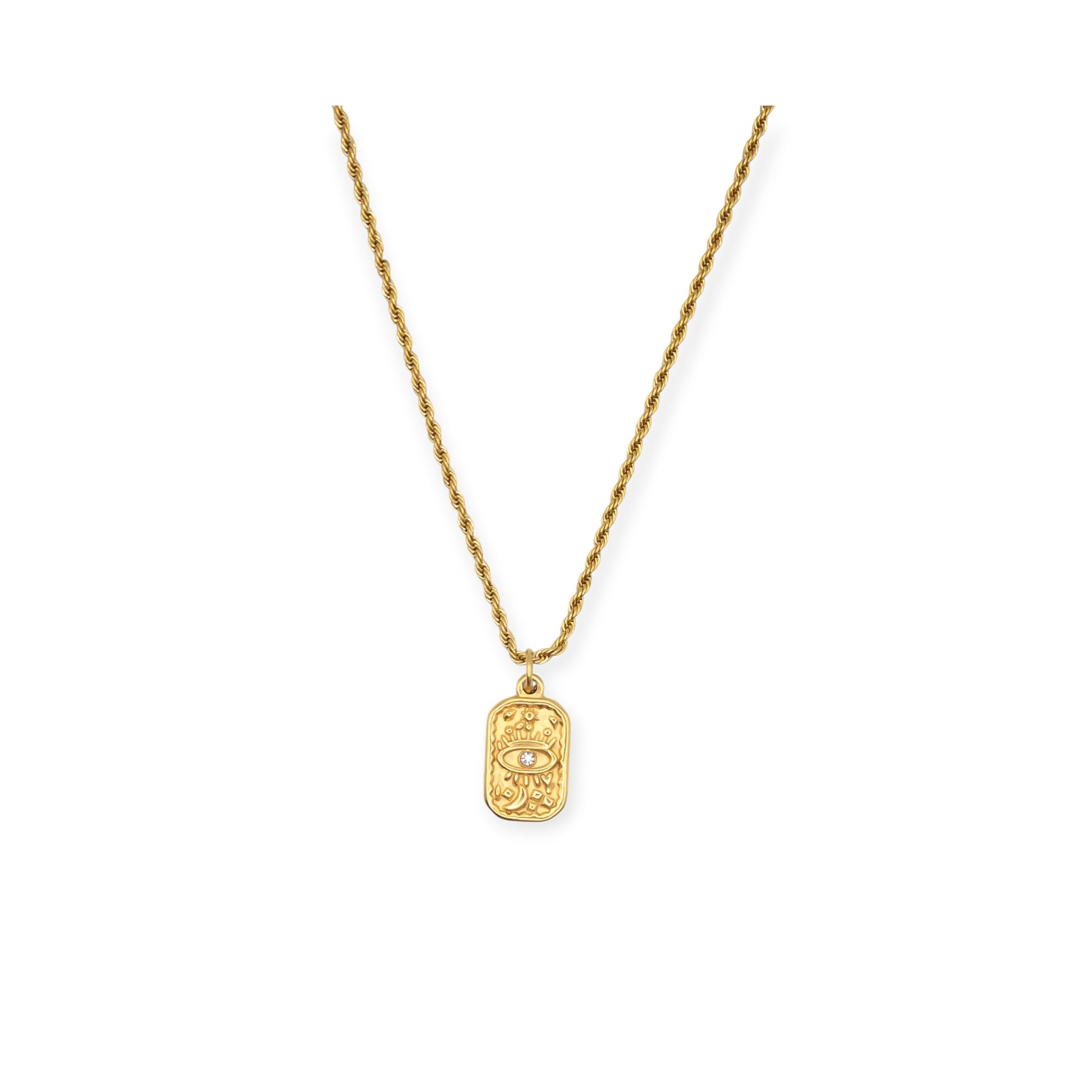 Um colar delicado em aço inoxidável dourado, com um pendente em relevo de um olho místico rodeado de detalhes. Resistente, elegante e perfeito para dar um toque de proteção e estilo ao teu look diário.