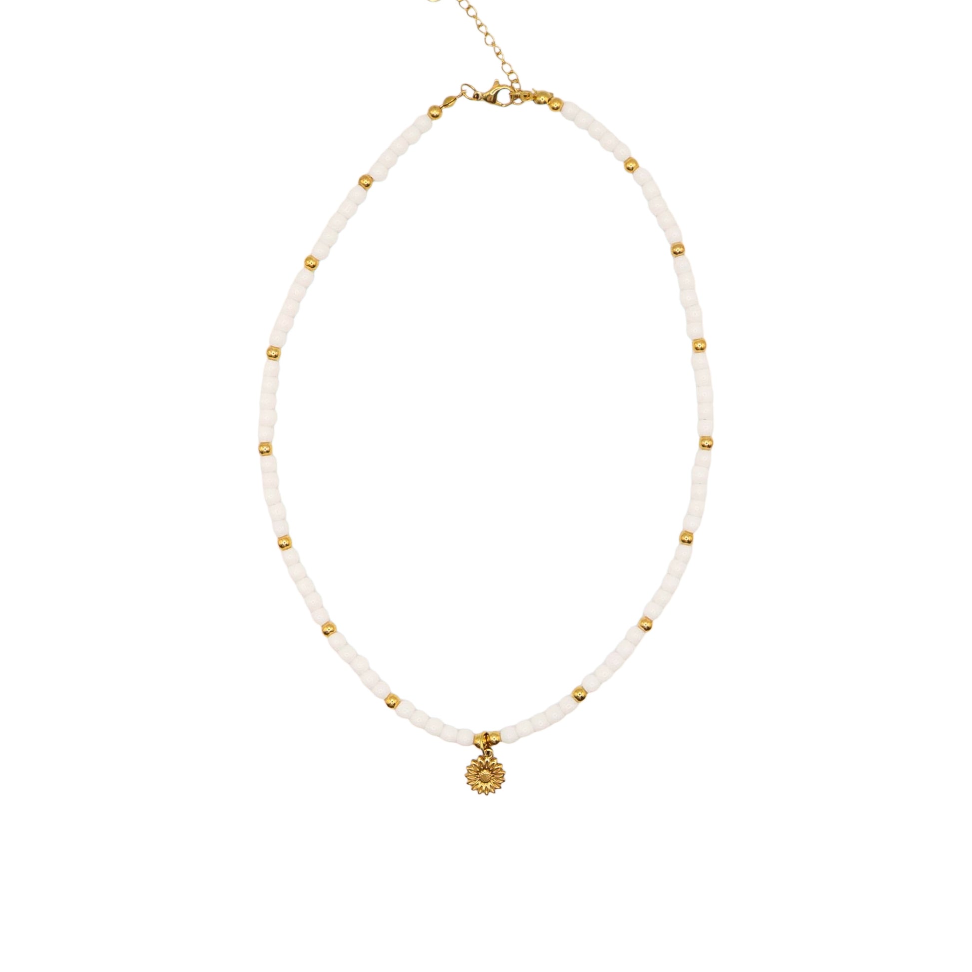 Este colar de pedras naturais brancas com detalhes dourados traz elegância a qualquer look. O pendente de flor dourado adiciona um toque especial, criando uma peça harmoniosa, versátil e perfeita para o dia a dia. Leve, resistente e feito em aço inoxidável, é o acessório ideal para quem procura simplicidade com um brilho único.