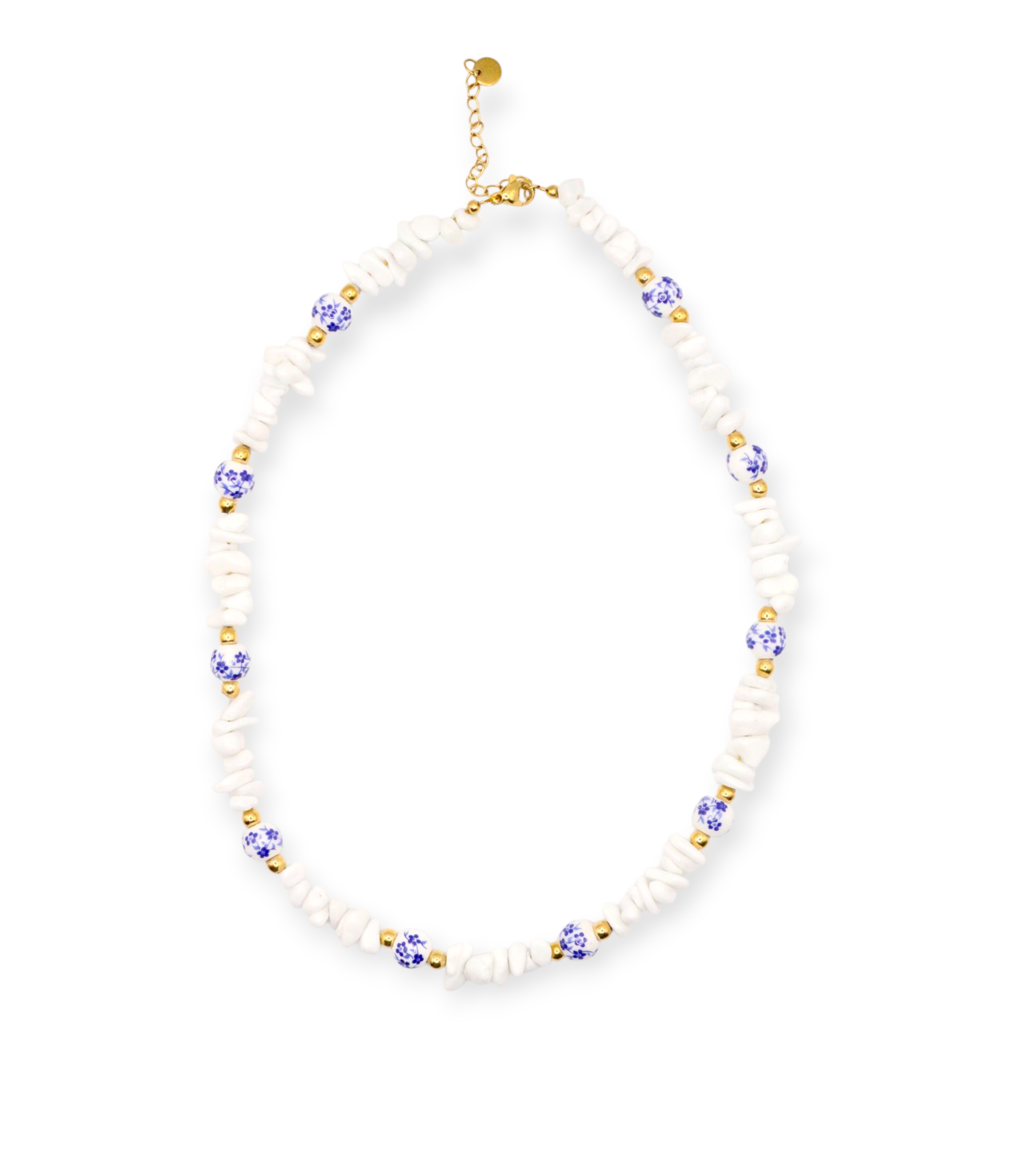 Colar feito com pedrinhas brancas e detalhes em cerâmica azul com acabamento dourado.