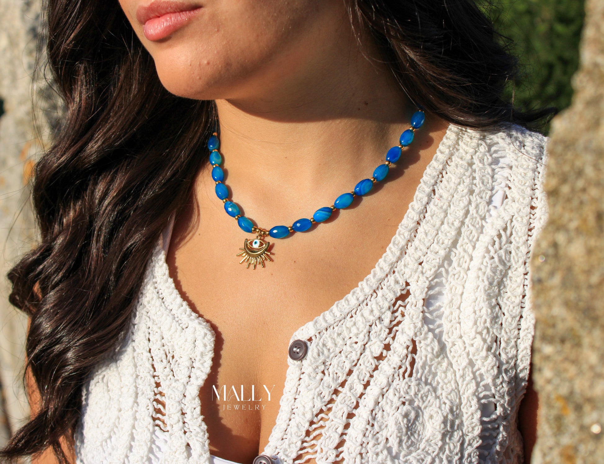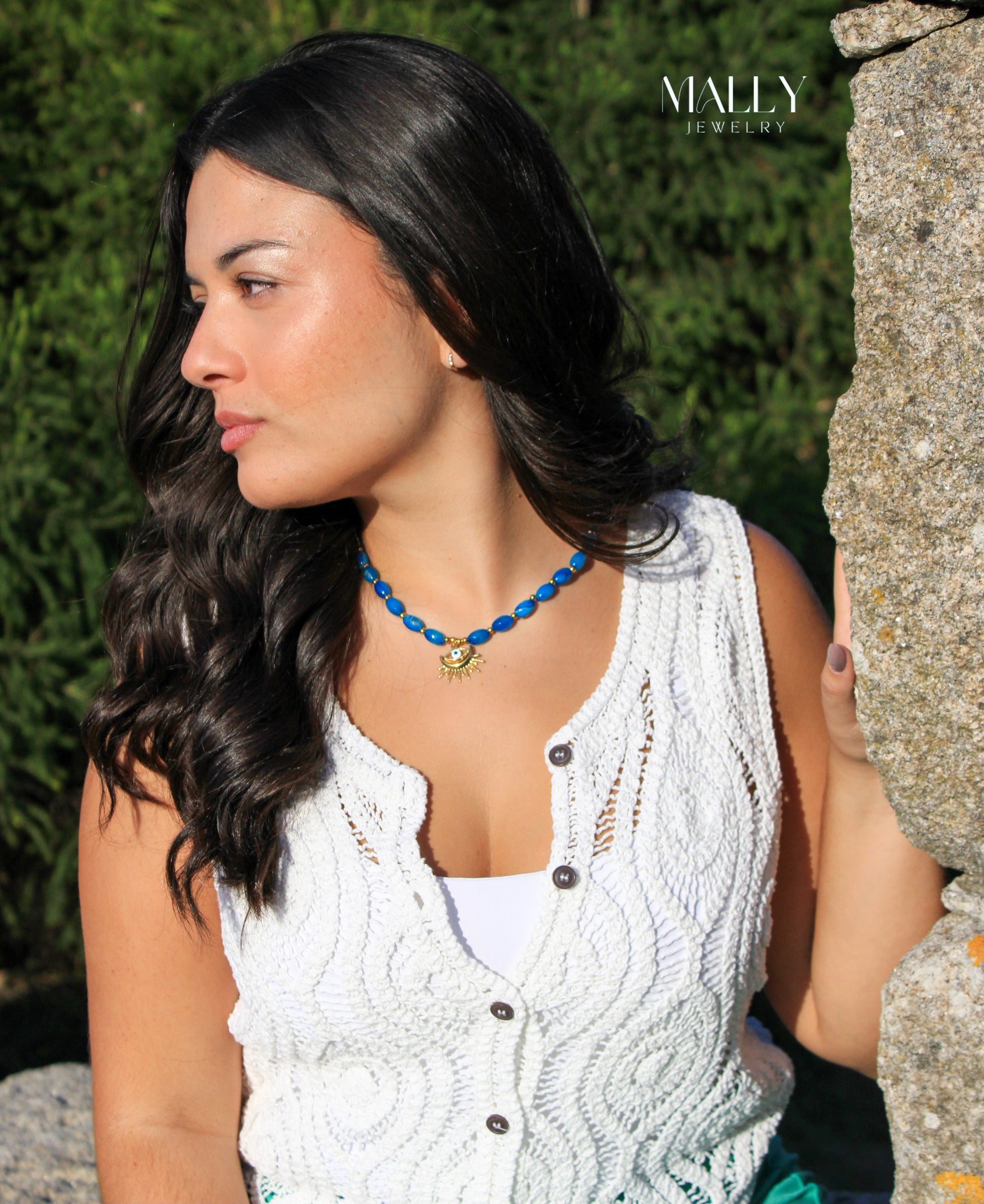 No centro, o pingente dourado em formato de olho, símbolo de proteção e energia positiva, acrescenta um toque de misticismo e estilo contemporâneo. O contraste entre o azul intenso das pedras e o brilho do dourado cria uma harmonia perfeita para qualquer ocasião — do look casual ao mais refinado.
